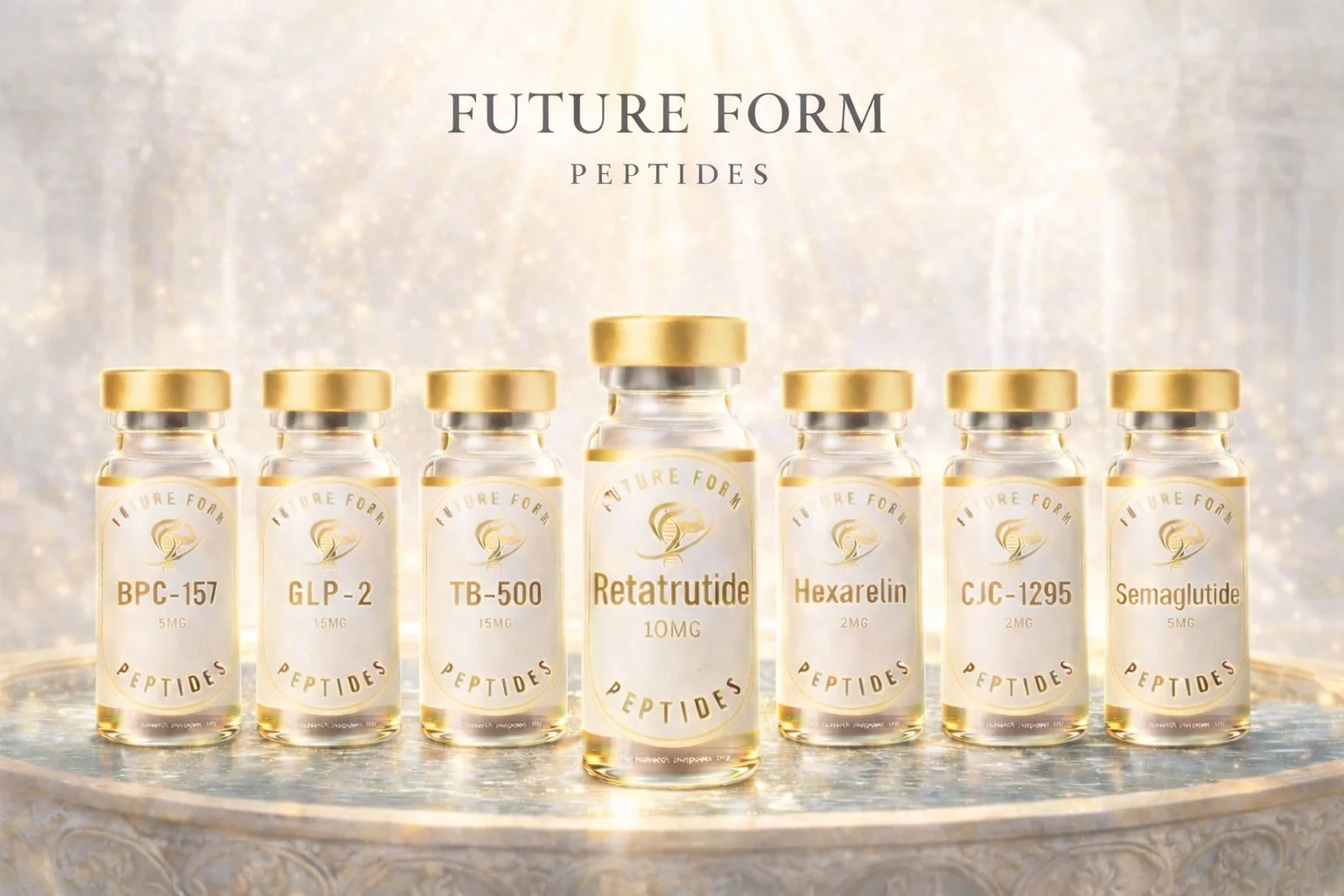 Seven small glass vials with golden caps displaying peptide labels, including BPC-157, GLP-2, TB-500, Retatrutide, Hexarelin, CJC-1295, and Semaglutide, on a white surface with a DNA strand background and a heading that says 'Future Form Peptides'.